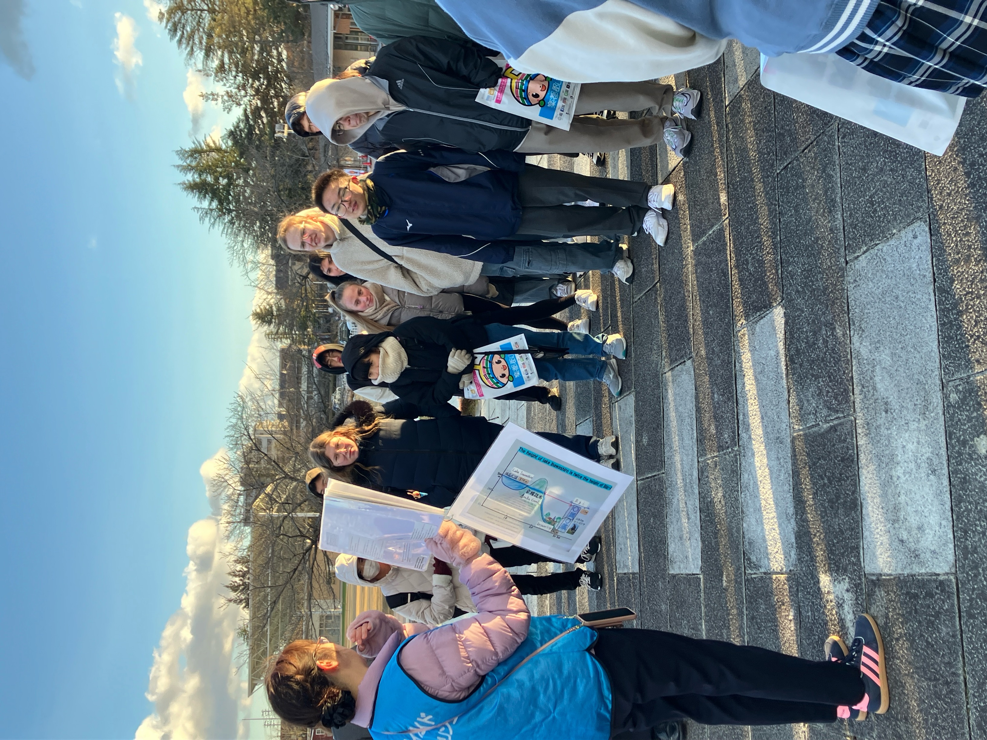 午後からは、郡山市役所の協力のもと、開成山公園で「ロゲイニング」を行いました。グループに分かれ、決められたポイントを巡り写真を撮って点数化し、優勝チームには郡山名物「クリームボックス」が贈られました。また、「がんばっぺチャリンコ」様による郡山の歴史学習も行われました。大変寒い日でしたが、両校生が協力し交流を深めることができました。 In the afternoon, with the cooperation of Koriyama City Hall, the students participated in a "Rogaining" event at Kaiseiyama Park. They split into groups, went around designated points, took photos, and were scored, and the winning team was awarded a "cream box," a Koriyama specialty. They also learned about the history of Koriyama through the volunteer group "Ganbappe Charinko." Although it was a very very cold day, the students were able to cooperate and deepen their exchanges.